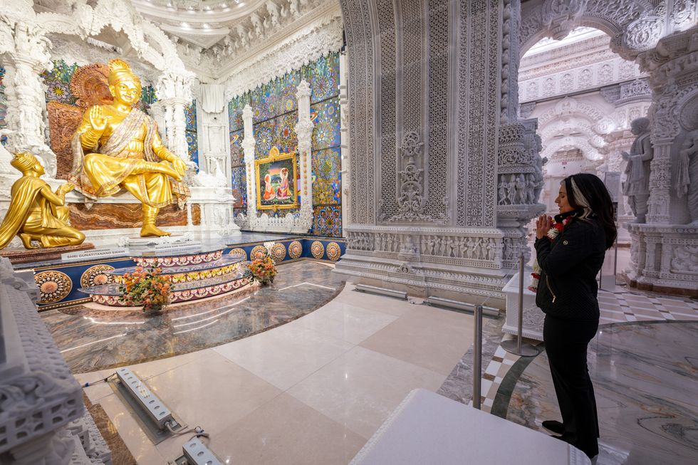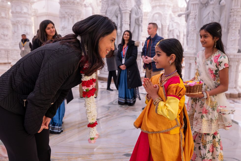 Reflecting on her visit, she added, “To be able to hear about the many thousands of hands and hearts that went into building this iconic temple, and to walk through and see the meaning behind every single one of those sculptures—both the magnificent and the small etchings of some of the most famous stories about Krishna and Arjuna from the Bhagavad Gita—was truly inspiring. This place is special because of all of you, your hearts, and your prayers that bring us all together."