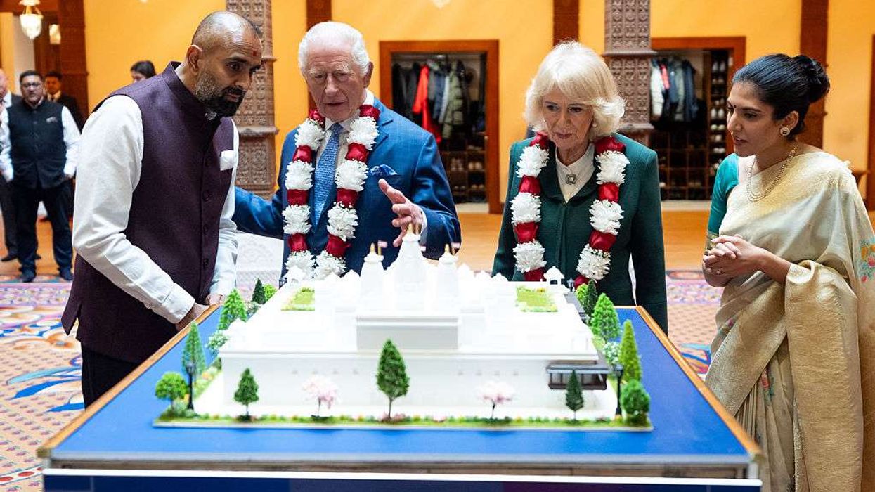King Charles III and Queen Camilla view a model of a new temple to be built in Paris, during a visit to BAPS Shri Swaminarayan Mandir (known as the 'Neasden Temple') on October 29, in Neasden, London. (Photo Aaron Chown - WPA Pool/Getty Images)