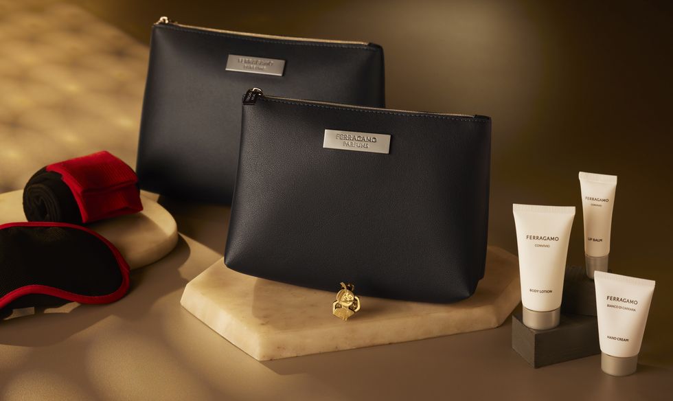“Business class passengers receive locally-inspired amenities, including a set of loungewear made from blended cotton for extra softness and breathability; a pair of slippers in the shoe storage compartment; a Ferragamo amenity kit which includes Ferragamo body lotion, hand cream, lip balm, comfortable socks, a plush eye mask within a cotton bag embellished with a lotus mandala pattern, and a gold Maharaja charm; an intricately-patterned day blanket that can also be used as a shawl; a two-in-one mattress and pillow that can folded as a firm cushion or opened when making your bed; and a very plush and comfortable duvet.