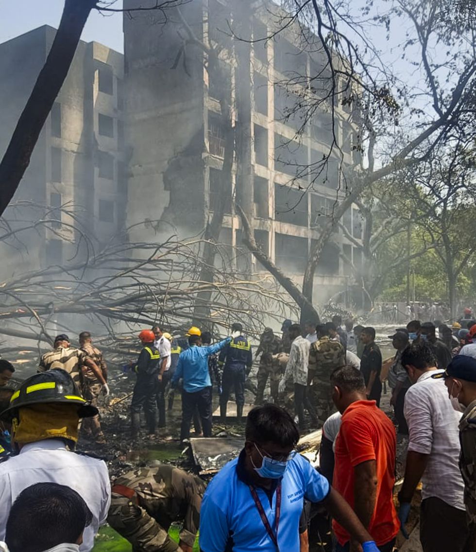Photographs released by India's Central Industrial Security Force, a paramilitary police force, showed a large chunk of the plane that had smashed through the brick and concrete wall of a building.