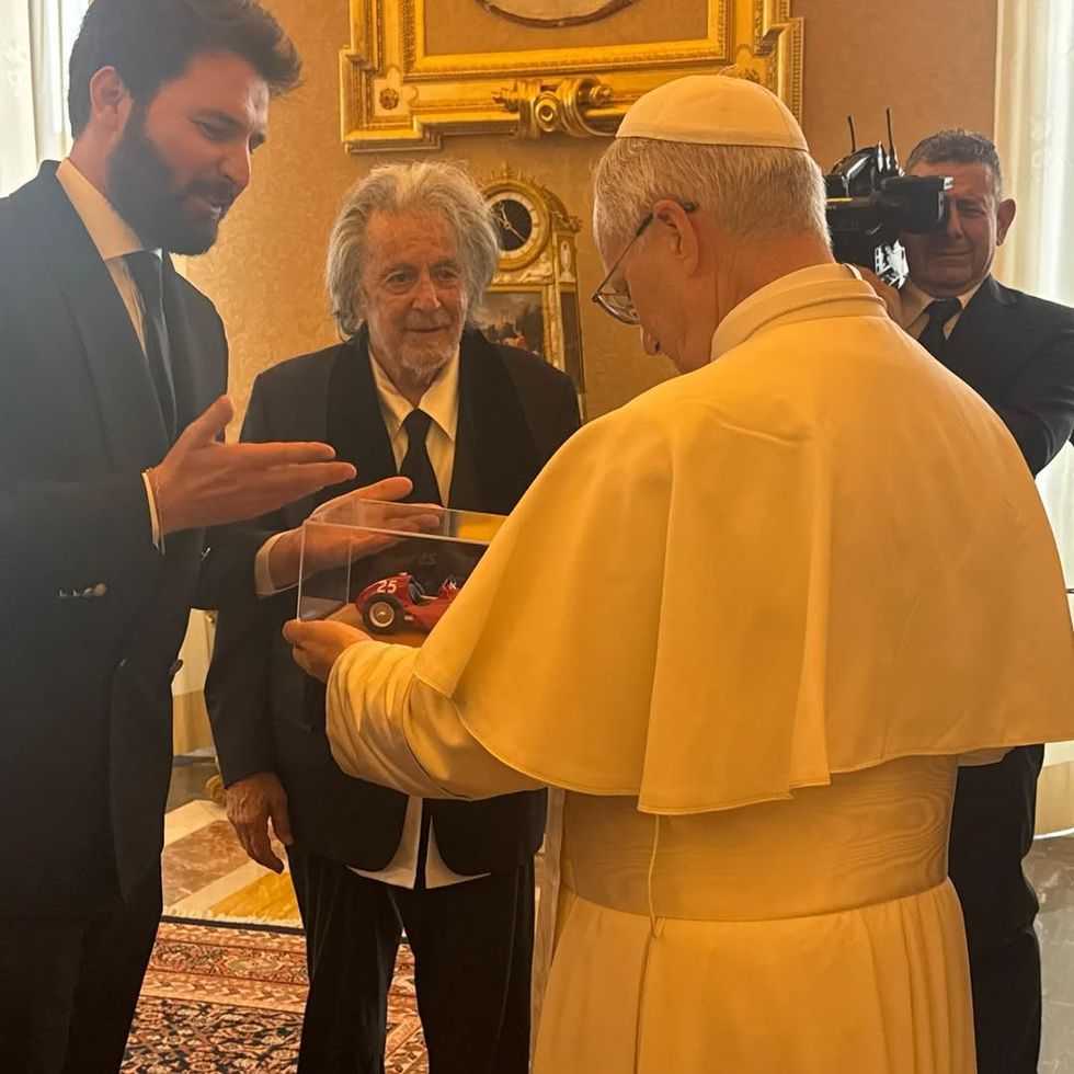 A photo from the visit shows Iervolino presenting a model Maserati in a glass case to the Pope, with Pacino looking on.