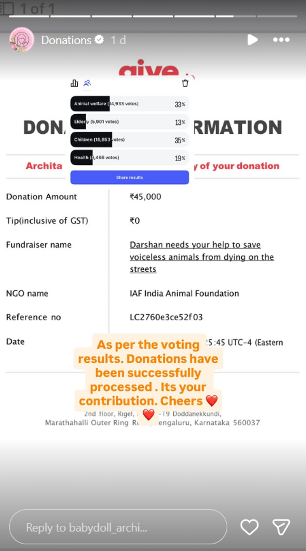 In her Instagram Highlights, Archita recently posted a screengrab of a poll where over 45,000 of her followers voted on causes they cared most about. The top two were rescuing children and helping animals. Following this, she donated £643 (₹75,000)—£258 (₹30,000) to an organisation working with children in red-light districts and £386 (₹45,000) to an NGO focused on animal welfare.
