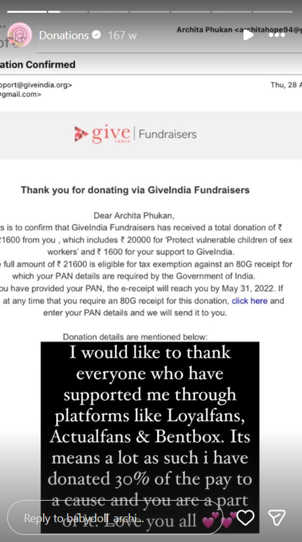 Archita's Instagram Highlight about donationsInstagram/babydoll_archi