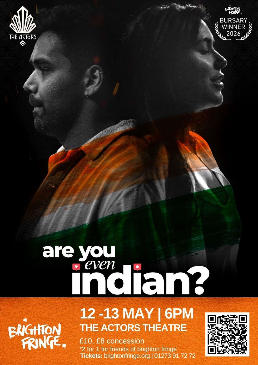 She is also co-founder of theatre company The Age We Are and has received recognition through the Leverhulme Arts Scholar programme. Are You Even Indian? runs for 60 minutes with no interval and is suitable for audiences aged 10 and above. Performances will take place at The Actors Theatre in Brighton on 12 and 13 May at 6pm. Tickets are priced at £10, with concessions available at £8.
