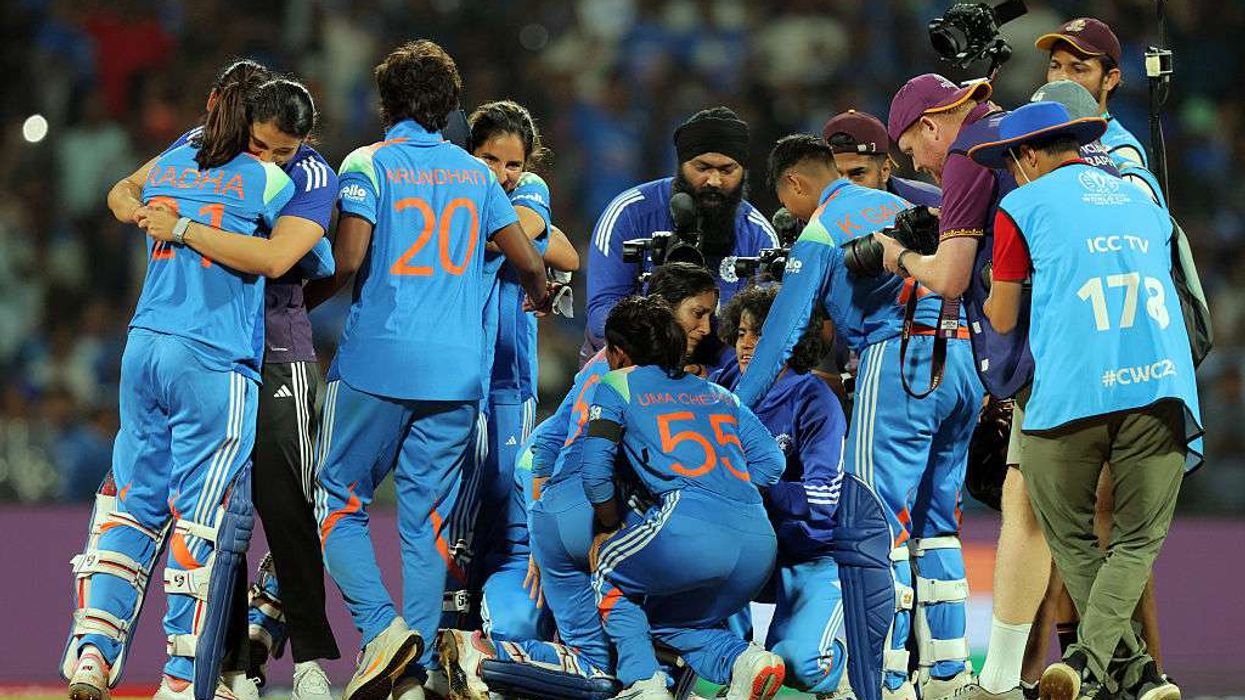 Jemimah Rodrigues and Amanjot Kaur of India celebrate with team mates following victory in the ICC Women's Cricket World Cup India 2025 Semi-Final match against Australia at DY Patil Stadium on October 30, 2025 in Navi Mumbai, India. (Photo by Pankaj Nangia/Getty Images)