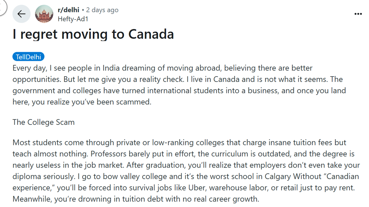 An Indian student currently studying in Canada has sparked widespread conversation on social media after sharing a Reddit post detailing their struggles and regrets about moving abroad. The post, which went viral on the r/delhi subreddit, offered a candid look at the realities many international students face when moving to countries like Canada in search of better opportunities. Titled “I regret moving to Canada,” the post highlights three major issues international students often grapple with: exploitation by colleges, financial struggles, and mental health challenges.