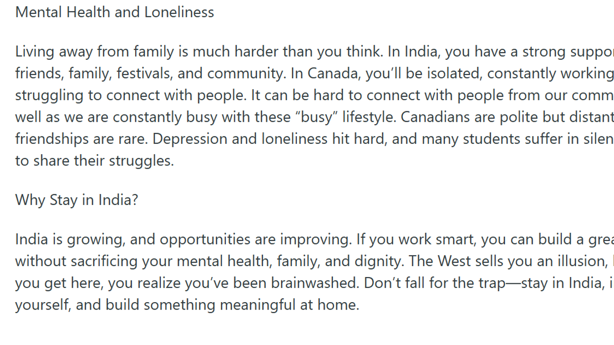 The third and final reason cited by the student is the emotional and mental toll that comes with living in Canada as an international student. The isolation, coupled with the financial and academic struggles, can have a devastating impact on one's mental health. “In India, you have a strong support system - friends, family, festivals, and community. In Canada, you’ll be isolated, constantly working, and struggling to connect with people,” they explained.