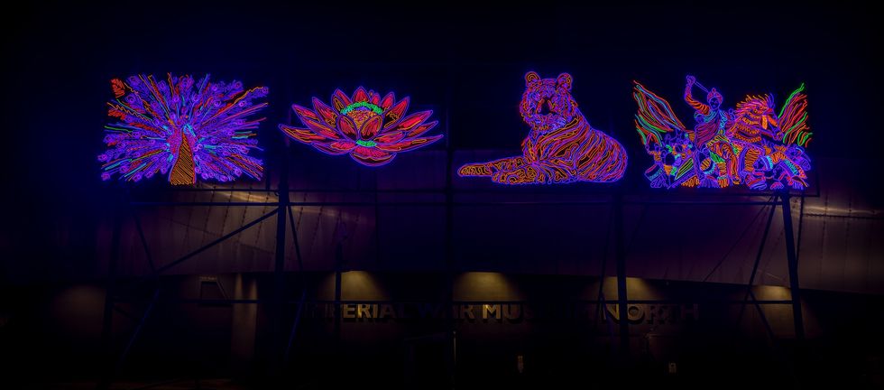 Chila’s neons, reflected in the waters of the Quayside in Trafford Wharf, include not only a tiger, but also a lotus, a peacock and her heroine, Rani Lakshmibai of Jhansi, one of India’s first female freedom fighters.