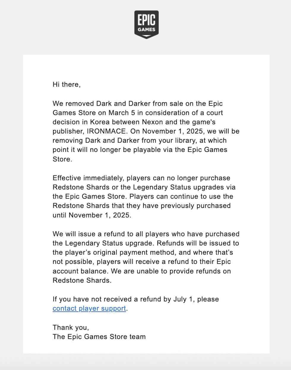 In an email confirmed by Epic and shared with PC Gamer, the company said, “We removed Dark and Darker from sale on the Epic Games Store on 5 March in consideration of a court decision in Korea between Nexon and the game’s publisher, Ironmace. On 1 November 2025, we will be removing Dark and Darker from your library, at which point it will no longer be playable via the Epic Games Store.”