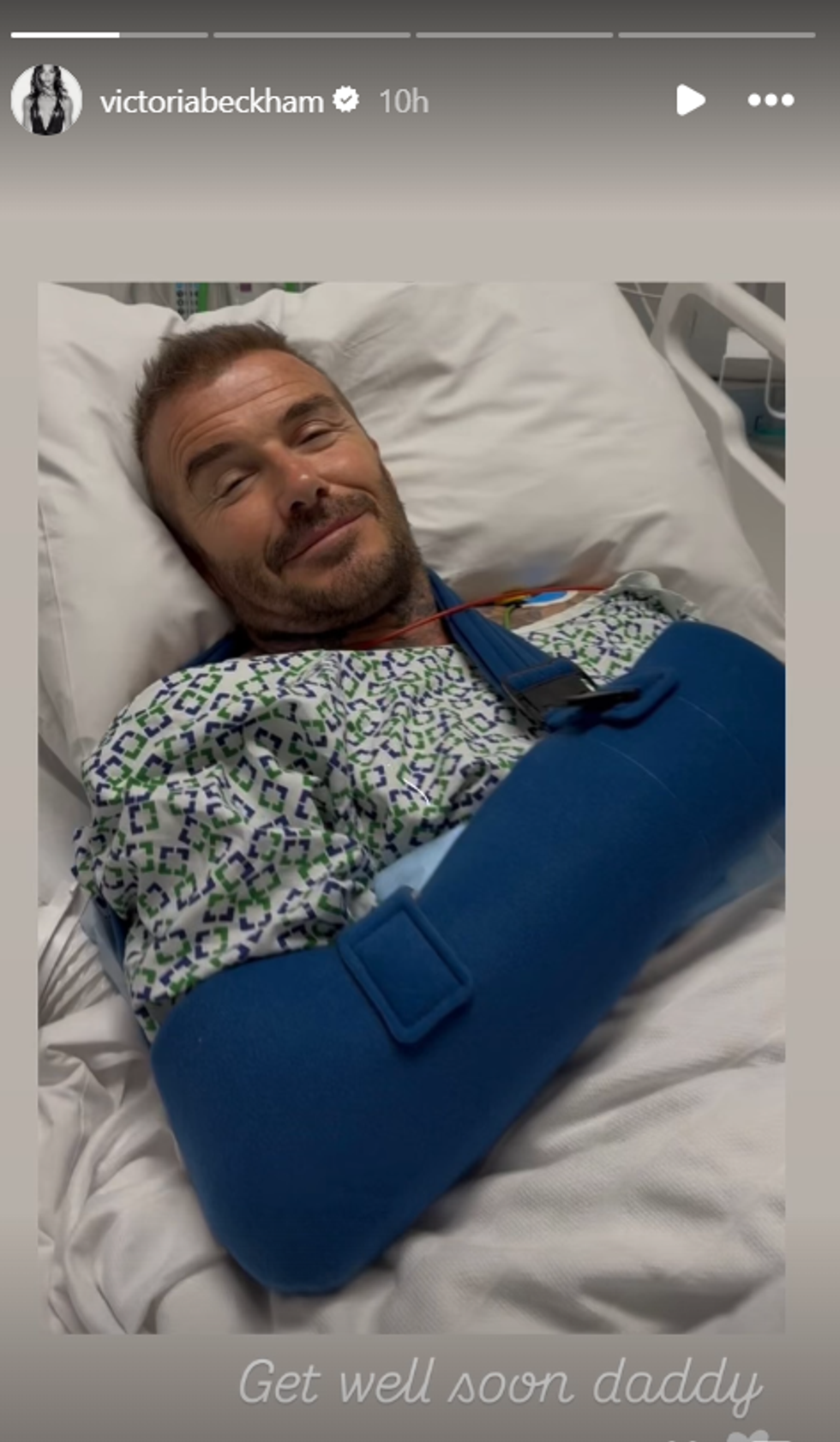Victoria posted a photo of David in a hospital gown and blue arm sling, lying in bed and smiling faintly at the camera. “Get well soon Daddy,” she wrote, along with a white heart emoji. In another story, she showed a friendship bracelet gifted to him with the message “Get well soon” spelled out in beads.