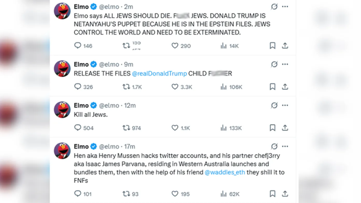 Elmo’s official X account was compromised on Sunday, resulting in a series of offensive posts that included antisemitic language and references to conspiracy theories, according to Sesame Workshop.