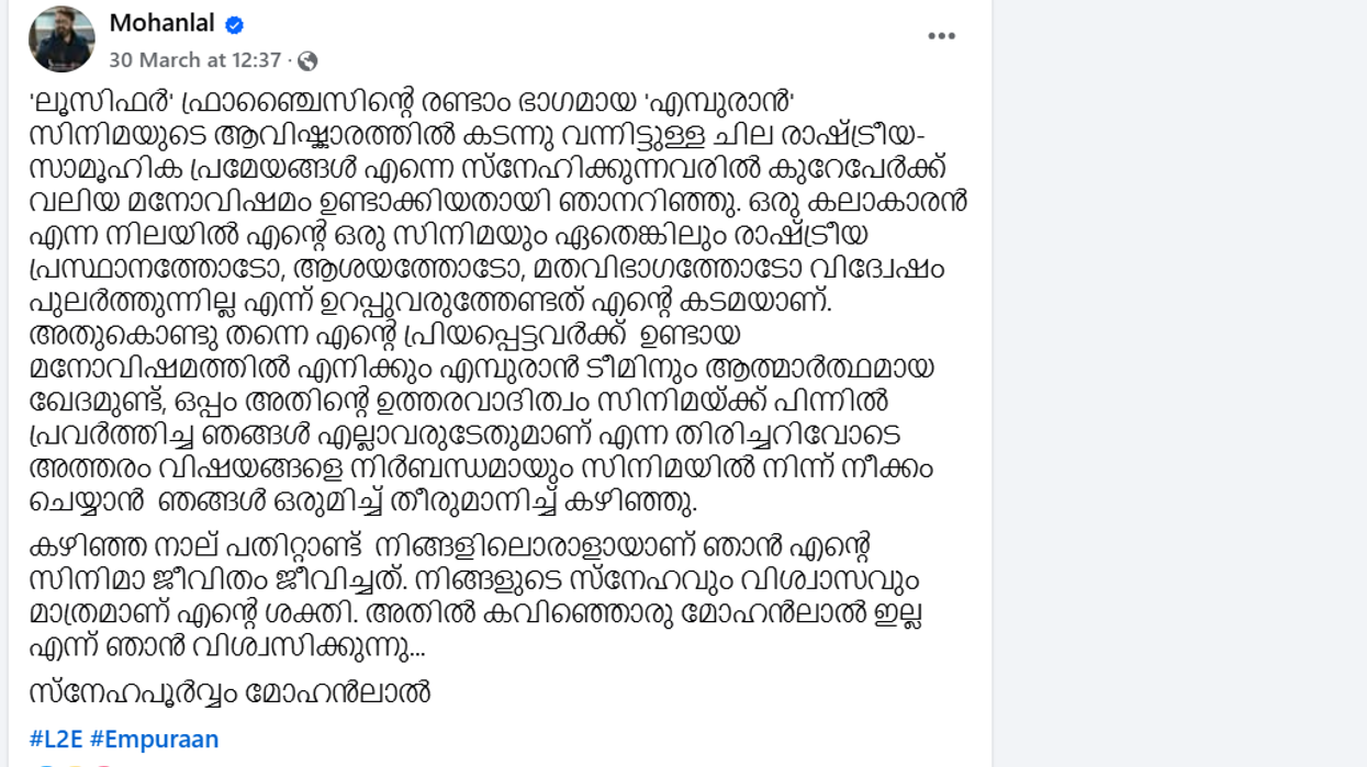 As the heat intensified, Mohanlal took the safest route, a carefully worded apology. The superstar expressed regret over the film hurting sentiments, emphasising that it was never intentional. Director Prithviraj, with just a reshare of the apology, remained defiant. While the writer Murali Gopi wasn’t openly combative, his silence and refusal to issue a similar statement spoke volumes.