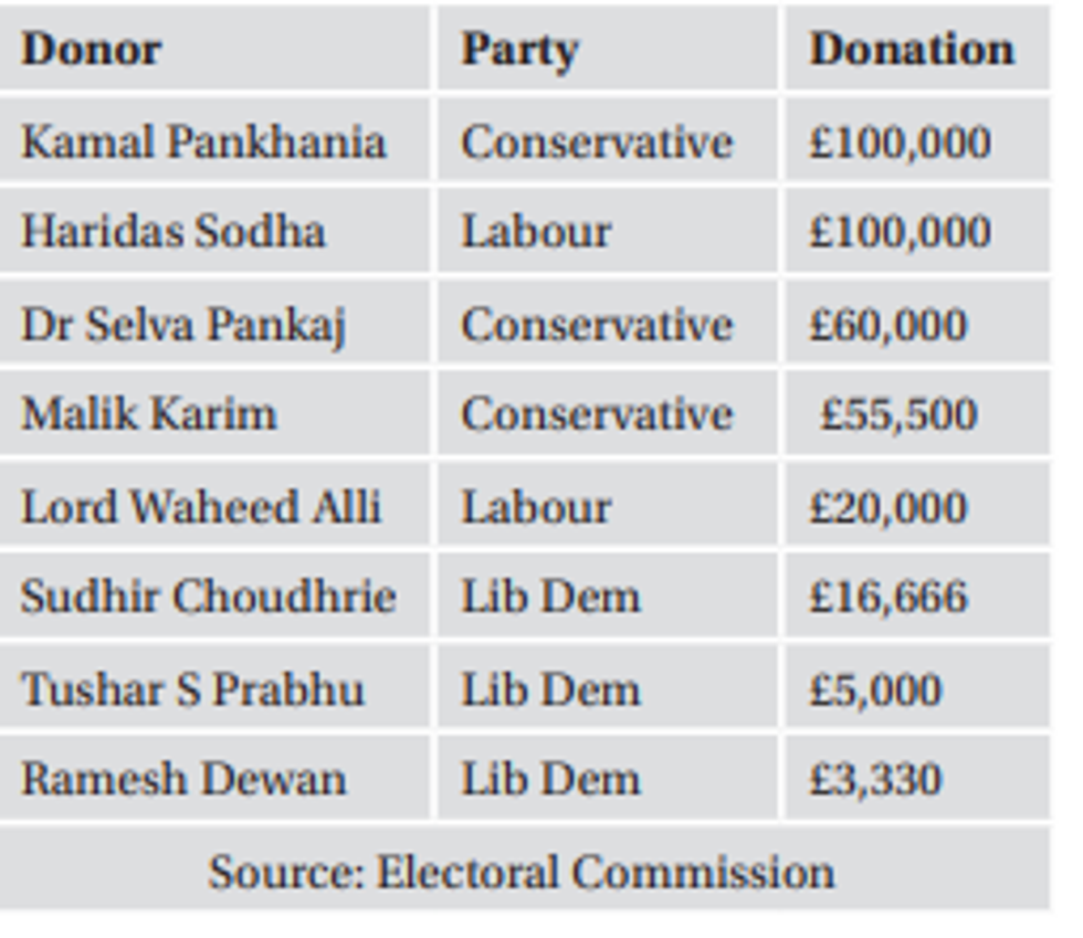 Among individual Asian donors, Kamal Pankhania and Haridas (Harish) Sodha stood out with £100,000 contributions each. Pankhania’s gift to the Conservatives in June and Sodha’s support for Labour in April were the largest Asian donations recorded during the second quarter of this year, data released on September 4 showed.