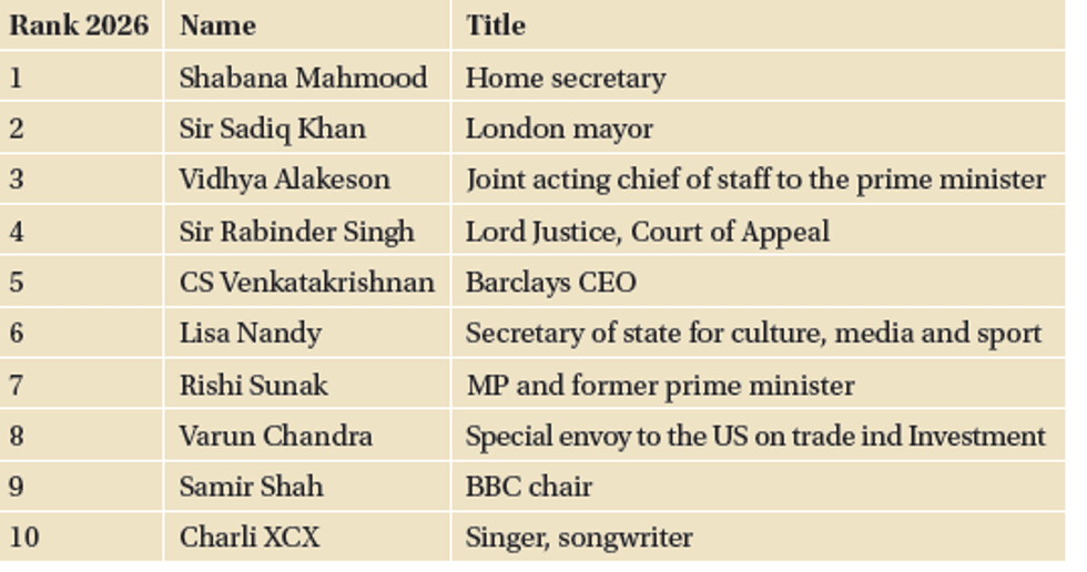 HOME SECRETARY Shabana Mahmood has topped this year’s GG2 Power List 2026, the annual ranking of the 101 most influential south Asians in the UK across politics, business, entertainment, sport and public life.
