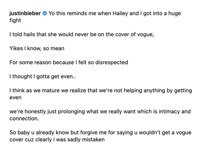 The pop star shared Hailey’s cover image with an unexpected confession: he once told her she’d never make it to Vogue during a past argument. While Justin tried to frame the post as a heartfelt apology and testament to her growth, fans didn’t see it that way. The caption struck many as tone-deaf, with critics accusing him of overshadowing Hailey’s achievement with an unnecessary anecdote that placed the focus back on him.