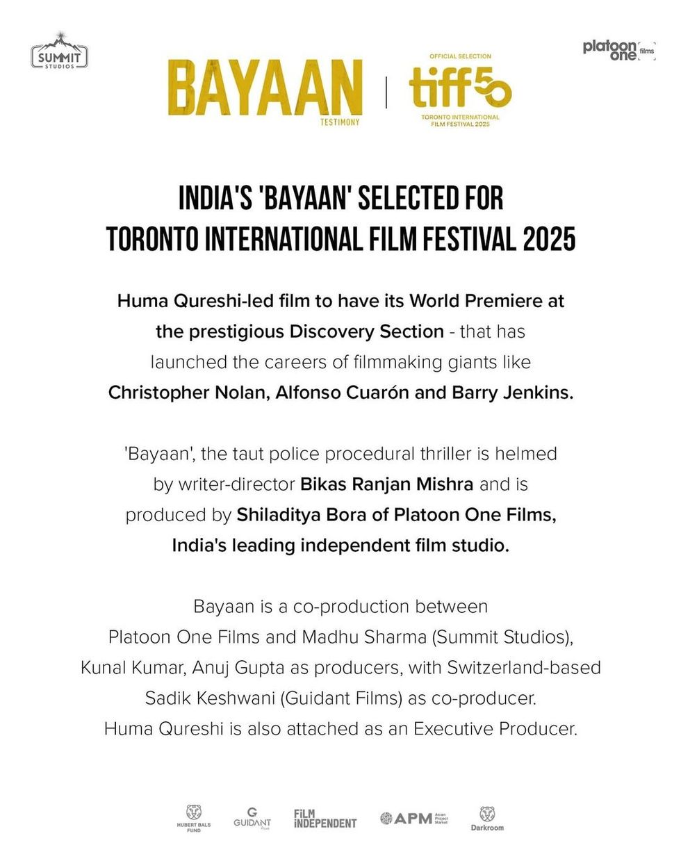 - Huma Qureshi-led Bayaan will premiere at Toronto International Film Festival 2025
