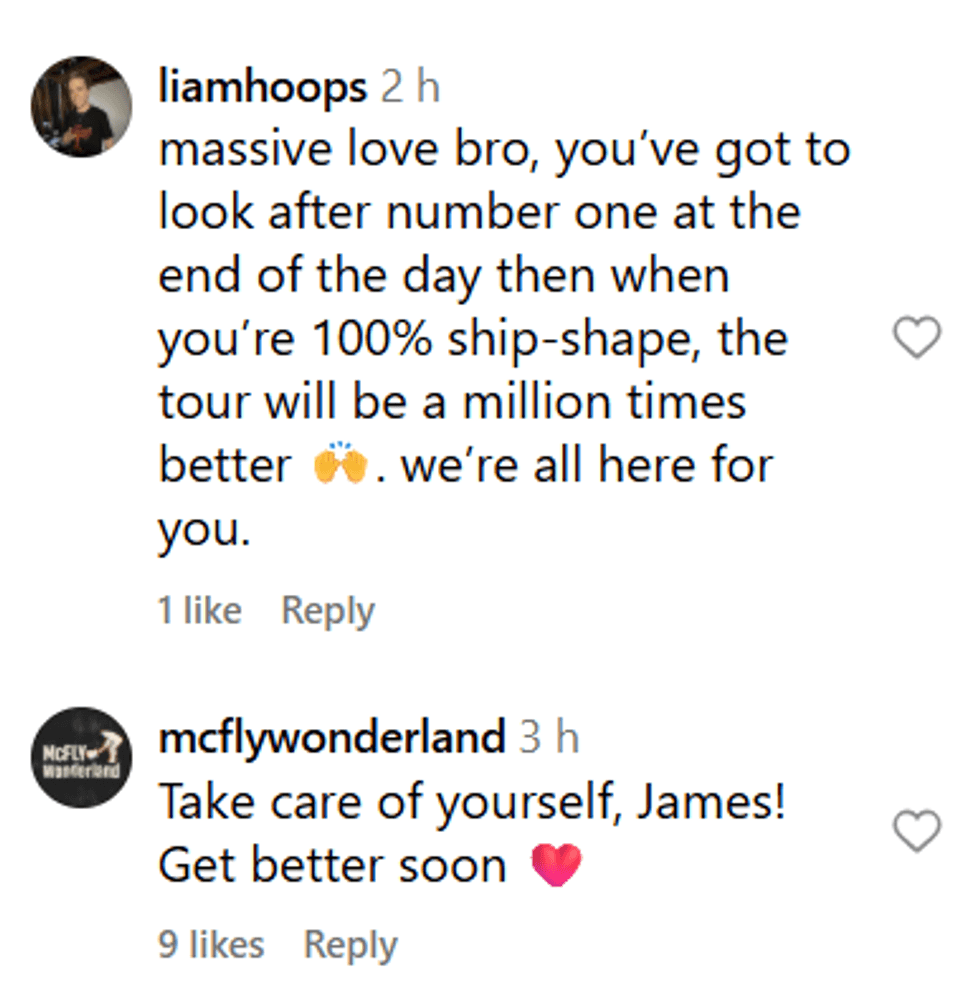 The announcement drew quick responses from Bourne’s colleagues in both bands. Harry Judd of McFly said: “Won’t be the same without you dude. Hope you’re back on tour asap.” Fellow McFly member Danny Jones reshared Bourne’s statement with the caption, “Get well soon mate,” while Matt Willis from Busted commented: “Love you brother…”
