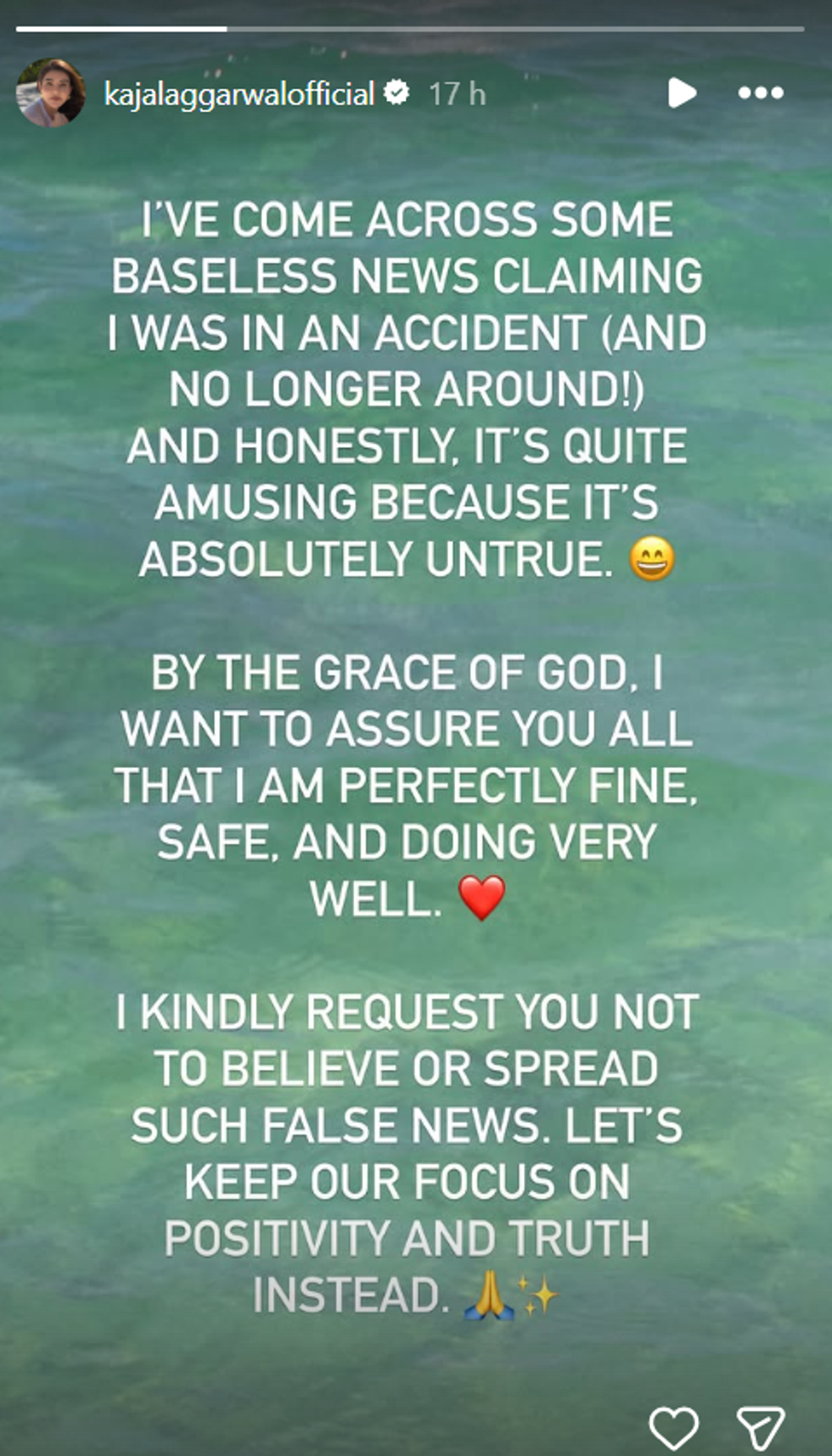 The false report suggested that Kajal Aggarwal had been involved in a fatal crash, with some posts claiming she sustained major injuries. Within hours, the news was widely shared across platforms, causing confusion among her fans. The actor responded swiftly on Instagram Stories and X, confirming she had not been in any accident.