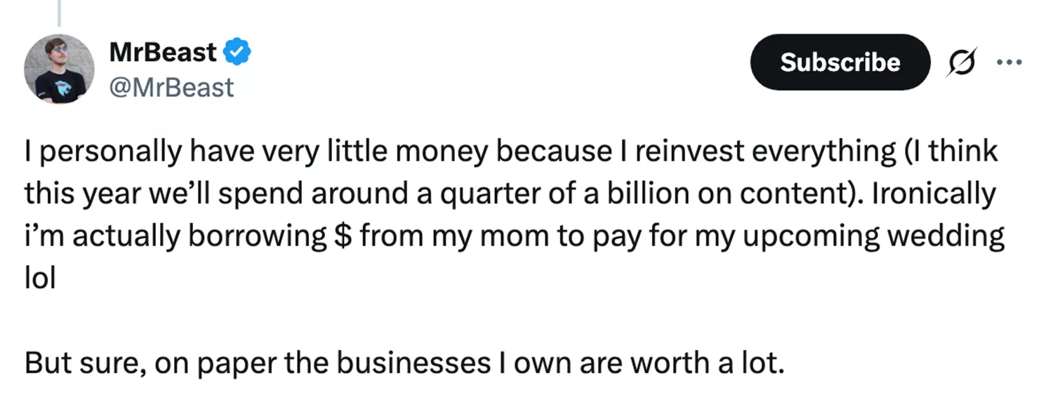 Jimmy Donaldson, better known online as MrBeast, is one of the most powerful creators on the internet. But while his videos rake in millions of views and his businesses are reportedly worth over a billion dollars, he says he’s currently short on cash, so much so that he’s borrowing money from his mum to pay for his upcoming wedding.