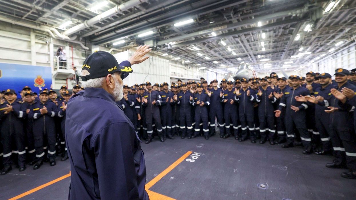 Modi interacts with naval personnel aboard INS Vikrant. (Handout via PTI Photo)