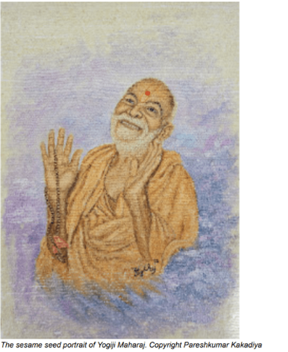 Kakadiya’s willingness to experiment is central to his career. His awards span multiple mediums, including a world record for the largest bubble wrap painting. Perhaps most striking is his portrait of Yogiji Maharaj, created using individually placed sesame seeds to form a densely textured surface.