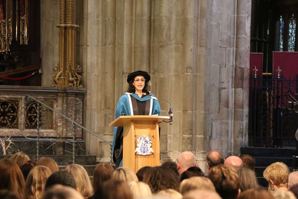Swaroop Sampat-Rawal stands inside the University of Worcester after receiving her new Fellowship