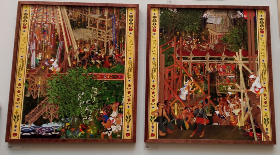 On display is work by a number of architects, including London-based Arinjoy Sen. “His work and interests have an acute focus on contested landscapes, citizenship, migration, narrative and spatial justice,” his studio said. “Sen brings a contemporary take on narrative painting, specifically evoking traditional forms such as Mughal miniatures, Kalighat paintings and pattachitra. He revisits the idea of the ritual through and beyond its association with religion.