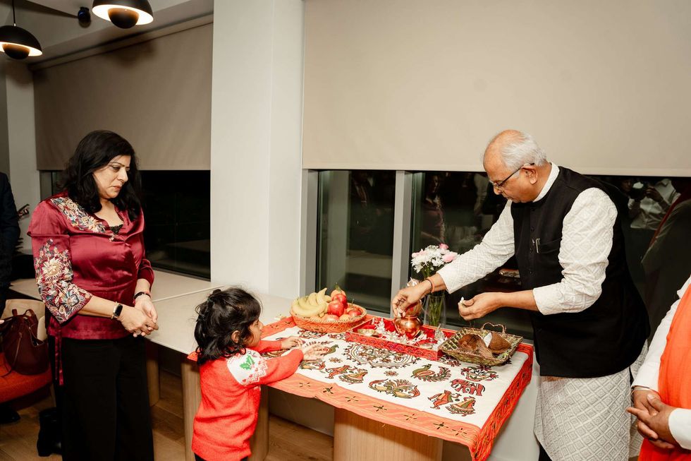 The ceremony was spiritually inaugurated with a Vedic prayer and Vastu Puja conducted by Dr M N Nandakumara MBE, Executive Director of the Bhavan. A sacred coconut-breaking ritual, led by HH Shri Rajrajeshwar Guruji, offered blessings for the new venture.
