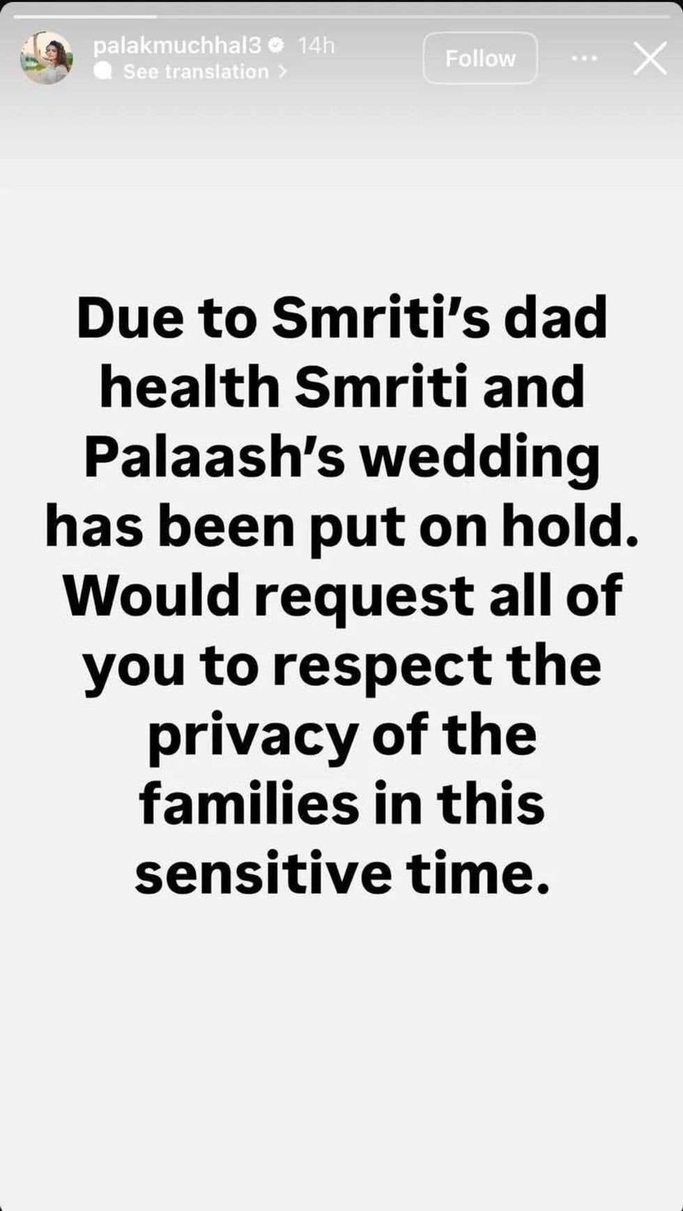 “Due to Smriti’s father’s health, Smriti and Palash’s wedding has been put on hold. We request you all to respect the privacy of both families during this sensitive time.”