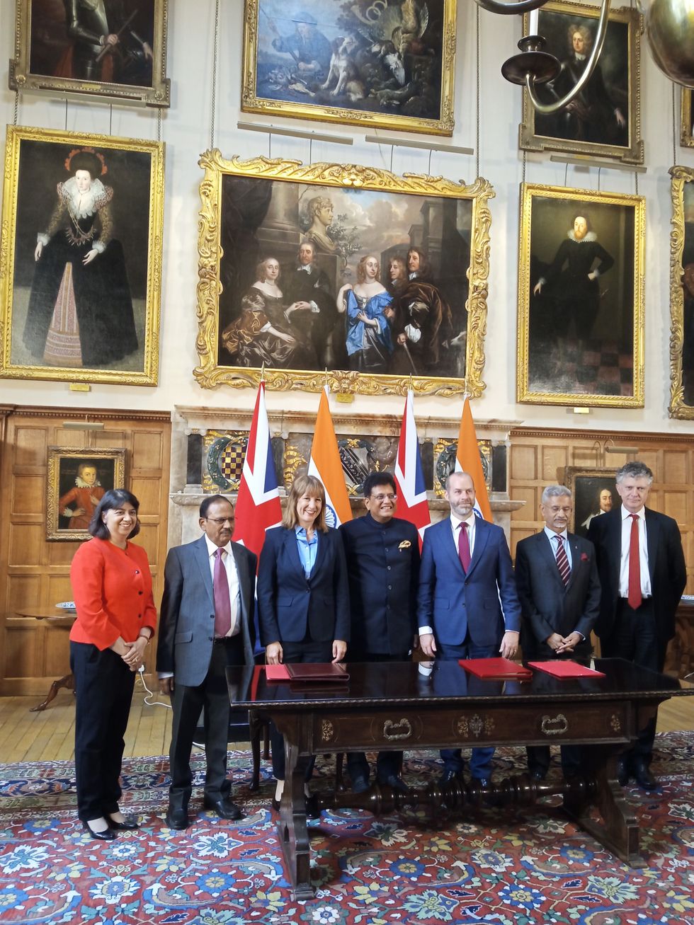 There were plenty of pictures, first of Reynolds and Goyal as they did the formal exchange of documents. Rachel Reeves, the chancellor, looked happy as she got a hug from Goyal. Soon, the line up for the “family photograph”, from left to right, included Seema Malhotra (UK immigration minister), Ajit Doval (Indian national security adviser, so the two sides must have talked about terrorism and defence), Rachel Reeves, Goyal, Reynolds, Subrahmanyam Jaishankar (India’s external affairs minister), and Jonathan Powell (the UK’s national security adviser – I noticed he had to persuade the police to allow him to jump the queue when he arrived at Chequers, with his demeanour faintly suggesting, ‘Don’t you know who I am?’)