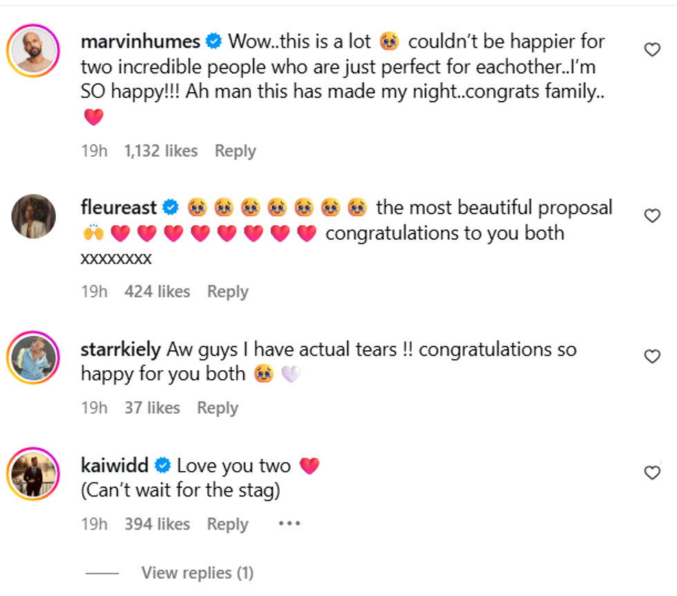 Celebrity friends and colleagues were quick to respond. EastEnders actress Patsy Palmer called it “so beautiful, perfect,” while co-star Aaron Thiara commented: “The sunset, the wind, the music. I’m not crying…” Jacqueline Jossa added: “Omg I can’t breathe,” and Louisa Lytton said: “MOLLYYYYY, congratulations guys xxxxx.”