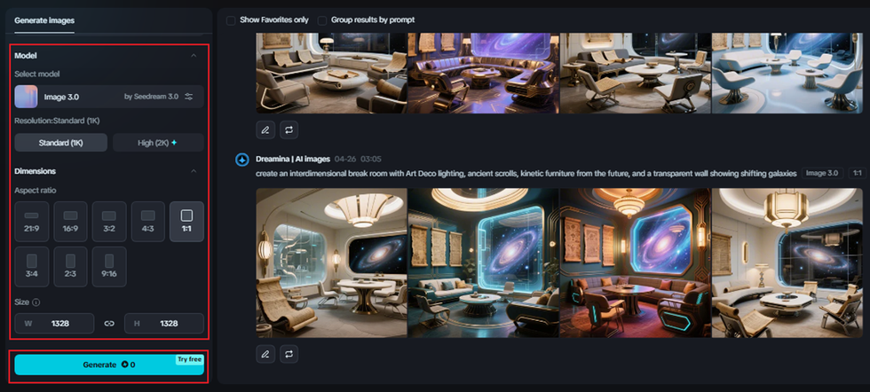 Having set your prompt, it's now time to dial in Dreamina's visual knobs. Select a model suited to your intent: maybe you'll go for a painterly feel for a more fantastical lounge or high-definition, photorealistic model for a space that's real to the touch and the eye. Then choose your aspect ratio—wide if you're imagining expansive, panoramic areas, or square when you're thinking about collectible sticker sheets or plush areas. Select your image size and resolution based on how much detail you desire. Once everything feels perfect, click "Generate," and your temporal break room will pop into existence in seconds.