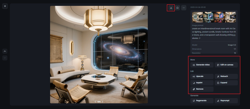 After your image is created, it's time to shape it even more. Employ the inpaint tool from Dreamina to add a temporal kettle onto an aged marble counter, or expand the borders of your lounge to expose more timelines and furnishings. Want to erase an eye-jarring detail? Employ the remove tool to tidy it up. Retouch enables you to tweak lighting, textures, and highlights until it emits both coziness and anachronism. Once you’re satisfied—once the chaise longue from Atlantis and the glowing tea pods from Pluto harmonize perfectly—click the “Download” icon and save your masterpiece. You’ve now captured a quiet corner of infinity.