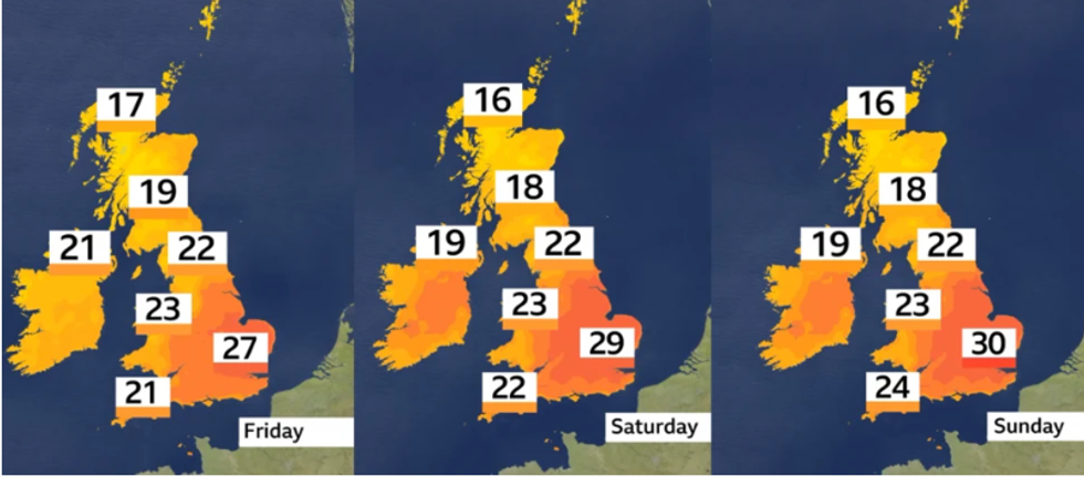 - Midlands, eastern and southeastern England could see highs of 30°C