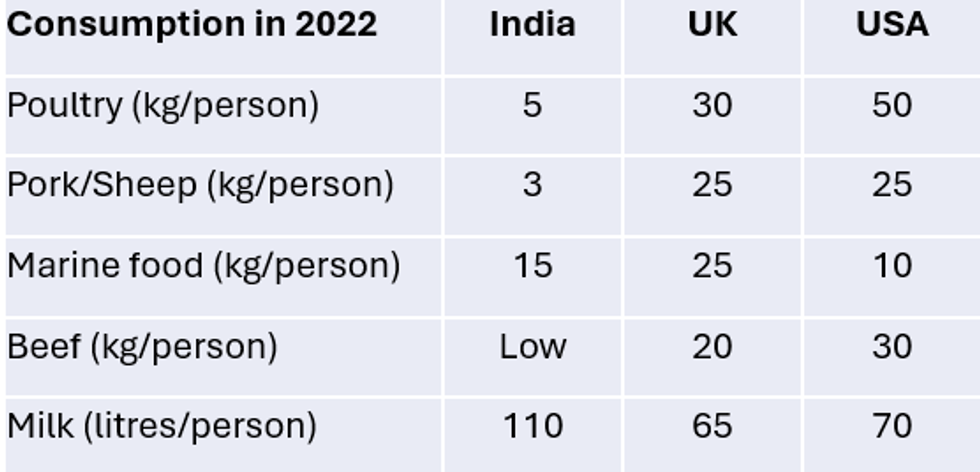 In modern times, however, bulls are almost entirely absent from agriculture, while milk demand has surged, leading to excessive cruelty toward cattle. The table below shows the per capita consumption of meat and milk in 2022 in India, the UK, and the USA: